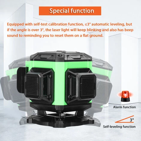 Ausgestattet mit Selbsttest-Kalibrierungsfunktion, automatischer Nivellierung von ≤3°, aber wenn der Winkel über 3° liegt, blinkt das Laserlicht weiter und die Laserebene gibt einen Piepton ab, um Sie daran zu erinnern, sie auf einem ebenen Boden zurückzusetzen.