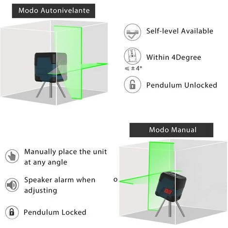 【AUTO LEVELING & 2 SELECTABLE MODES】 Im Automatikmodus ist der Self Leveling-Modus mit einem Neigungsbereich von 4 ° verfügbar. Der Laser nivelliert sich automatisch. Andernfalls blinkt der Laserstrahl über die Neigung von 4 ° hinaus und löst einen Alarm aus, um anzuzeigen, dass er nicht mehr eben ist. Sperren Sie das Pendel, um in den manuellen Modus zu wechseln. Die automatische Nivellierungsfunktion ist deaktiviert und gesperrt, damit das Gerät aus allen Winkeln verwendet werden kann.