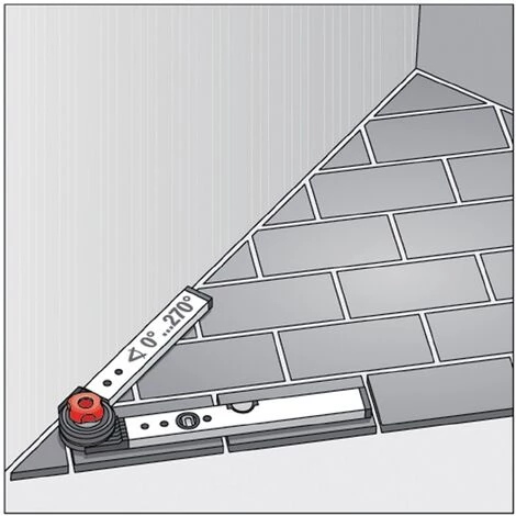 bestehend aus einer Alu-Profil-Wasserwaage mit einem variablen Alu-Profil-Schenkel · Wandstärke 1,6 mm · Messbereich 0 – 270° · die Indexscheibe des Gelenks kann in zwei verschiedenen Positionen eingelegt werden · danach können die Winkel wahlweise in 15°-Rasterung oder stufenlos eingestellt, fixiert und abgelesen werden Weitere technische Eigenschaften: · Ausführung: mit Wasserwaage