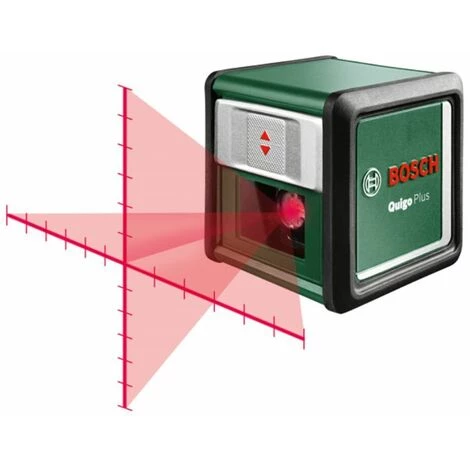 Kreuzlinien-Laser Quigo Plus. Quigo Plus – Das Plus beim Gestalten. Ausrichten in gleichen und variablen Abständen dank Markierungen auf der Laserlinie. Projiziert gleichzeitig eine horizontale und vertikale Laserlinie. Automatisches Ausrichten – immer 100 Prozent gerade. Unterstützt beim Anbringen von Objekten im gleichen Abstand. Perfekt für schnelles und gerades Ausrichten von Bildern. Bordüren. Tapeten. Fliesen und Objekten. Ein schräges Positionieren des Gerätes projiziert gleichmäßig zu- bzw abnehmende Abstände der Markierungen und eröffnet damit viele Möglichkeiten für kreative Anwendungen. Supereinfache Handhabung. Schräge Linien durch Neigen des Gerätes möglich. Exakte Höhenverstellung durch mitgeliefertes Stativ. Batterien 2 x 1.5-V-LR03 (AAA). Zieltafel. 1.1 m Aluminiumstativ