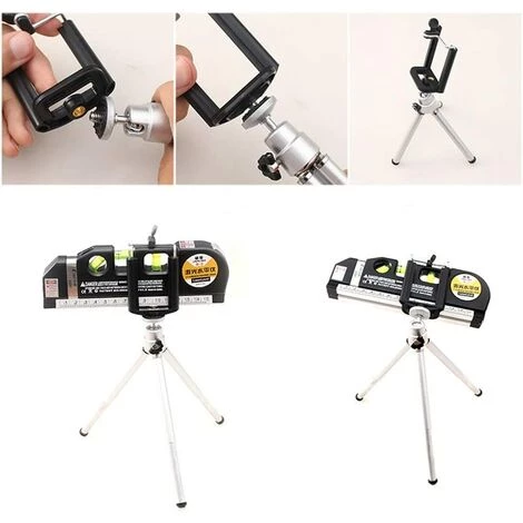 Kombinierte Lasernivellierung: Beinhaltet Laser, Maßband, vertikale und horizontale Blasen und einziehbares Metallstativ.