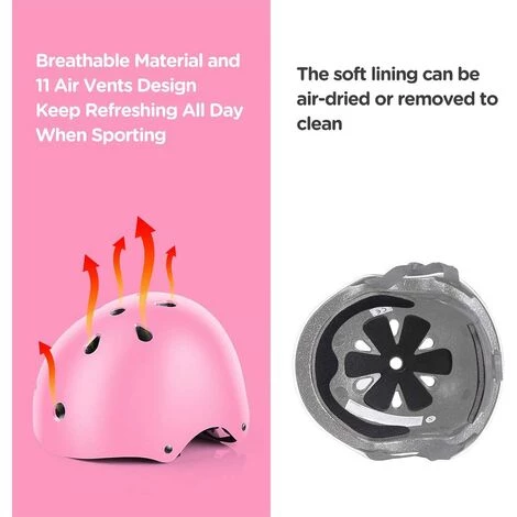 Atmungsaktiv Der Rollenschutz und der Fahrradhelm sind atmungsaktiv. Der Fahrradhelm verfügt über 11 atmungsaktive Belüftungsöffnungen, um die Luftzirkulation zu ermöglichen und den Kopf kühl zu halten. Spezielles Multi-Vent-Design und atmungsaktiver Schaumstoff, Helme und Polster helfen Kindern, sich auch bei intensiven Körperbewegungen kühl und wohl zu fühlen.