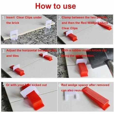 【Verwendung】1. Stecken Sie die Clips unter die Fliesen. 2. Zwischen zwei Fliesen klemmen, dann waagerecht halten. 3. Stecken Sie den Keil in einen Clip. 4. Justieren und mit einer Nivellierzange festziehen. 5. Warten Sie 24 Stunden und verwenden Sie aHammer, um die Oberseite der Clips vorsichtig zu lösen. 6. Nehmen Sie die Keile für den nächsten Gebrauch zurück.