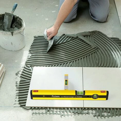 Nicht selten verrutscht beim umständlichen Hantieren damit mindestens eine wieder und die Geduldsprobe startet von vorn. Die FLÜWA Wasserwaage schafft hier mit einem cleveren Feature Abhilfe! Sie bringt die zweite Wasserwaage gleich mit – integriert in einen ausklappbaren „Flügel“! Einfach anlegen, ausklappen, auspendeln, fertig! Die so deutlich erleichterte Handhabung ermöglicht präzisere Ergebnisse.