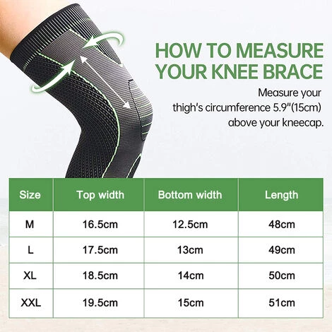 ProduktbeschreibungMaterial: NylonGröße:M: obere Breite 16,5 cm, untere Breite 12,5 cm, Gesamtlänge 48 cmL: obere Breite 17,5 cm, untere Breite 13 cm, Gesamtlänge 49 cmXL: obere Breite 18,5 cm, untere Breite 14 cm, Gesamtlänge 50 cmFarbe: grün, schwarzMenge: 1 PaarPackungsinhalt: 1 Paar * lange Knieschoner (mit Anti-Rutsch-Streifen)1.【Schmerzlinderung und schnelle Genesung】: Unsere Kniebandagen für Knieschmerzen mit Kompression können die Durchblutung und den Sauerstofffluss fördern, um Knie- und Wadenschmerzen zu lindern, Krampfadern und Schwellungen der Beine zu reduzieren. Perfekt für Arthritis, Sehnenscheidenentzündung, Schwellungen, Meniskusriss, Zerrungen, Verstauchungen, Wadenkrämpfe und Erholung nach Operationen.2.【Professionelles Kompressions-Design】 Enges und atmungsaktives Kompressionsgewebe hält die Gelenkstabilität unabhängig von sportlichen Aktivitäten aufrecht, während der Juckreiz vermieden wird. Absorbiert schnell Schweiß und hält Ihr Bein trocken, gibt Ihnen stundenlangen Dauereinsatz. Zudem sorgt es für erhöhten Bluttransport zu Muskeln über die gesamte Länge und hält die Beine warm.3.【Perfekte Unterstützung und Schutz】: Unsere Bein-Kompressionsmanschetten mit hervorragendem verlängertem Design bieten eine perfekte 360°-Passform für umfassenden Schutz und Wärme von Ihrer Wade bis zum Oberschenkel. Mit unseren langen Beinstulpen können Sie Verletzungen effektiv verhindern, die durch Bewegung oder jede Aktivität verursacht werden, die Druck auf Ihre Knie und Wadenmuskulatur ausübt. Erhöhen Sie sofort Ihre Leistung und Ihr Selbstvertrauen.4.【Geeignet für Männer und Frauen】Bitte überprüfen Sie die Größentabelle vor dem Kauf, um die Kniebandagen und Unterstützung zu wählen, die für Frauen, Männer und Kinder geeignet sind. Es kann unter der Hose versteckt werden und passt sich Ihrem Oberschenkel diskreter und bequemer an als die Klettverschluss-Kniebandagen an. Bequem für den ganzen Tag.5.【Geeignet für】: Geeignet für alle Aktivitäten und Übungen, die Ihre Gelenke sehr nutzen müssen, wie Laufen, Yoga, Tanzen, Kniebeugen, Gewichtheben, Fitnessstudio, Fitness, Joggen, Wandern, Crossfit, Golf und mehr. Sie werden in der Lage sein, eine außergewöhnliche Kniebandage zu genießen, während Sie Ihre Spitzenleistung und eine volle Auswahl an Beinbewegungen beibehalten.