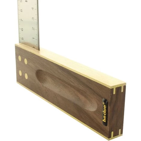 Der Schenkel ist aus hochwertigem Nussbaumholz gefertigt und mit einem Messingprofil am Innenschenkel beschlagen. Durch die beidseitige Griffhohlkehle liegt der Winkel stets gut in der Hand.