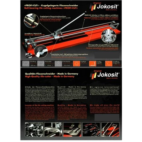 Original Jokosit Fliesenschneider Profi Cut 164, mit Stahlblech Grundplatte und Winkel 90°, gehärtete und geschliffene Führungswellen, Linearkugellager, Präzisonsführung, schneidbare Fliesenstärke max.: 18mm, Schnittlänge: Diagonalschnitt-Geradschnitt max.: 600 mm, Gewicht: 7.7 Kg, zum Schneiden und Brechen von Fliesen, Platten, Mosaik, etc.