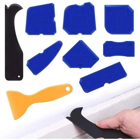 ✎ 1 gelber Fugenschaber, 1 schwarzes Werkzeug zum Entfernen von Versiegelungen und 7 Silikon-Endbearbeitungswerkzeuge.< br>