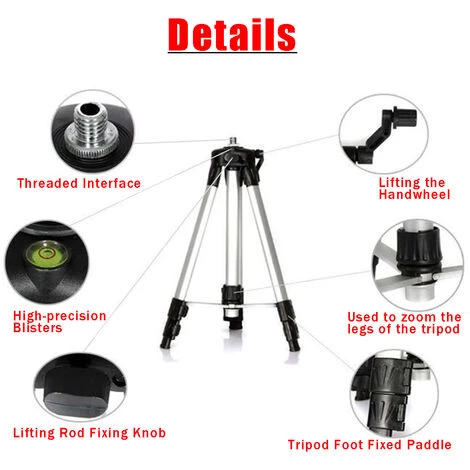– Gewindeschnittstelle – Edelstahl, korrosionsbeständig, Schnittstelle für Niveauanschluss < br /> – Hochpräzise Blister – justieren Sie die Höhe des Stativs mit Blasen im Wasser