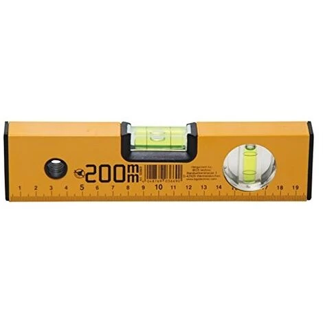 lackierter Aluminiumkörper im Rechteckprofil vertikale und horizontale Libelle gefräste Sohle für hohe Geuigkeit mit Hängeloch Länge: 200 mm Messauflösung: 1 mm Messgeuigkeit: 0,75 mm/m Bruttogewicht: 98 g