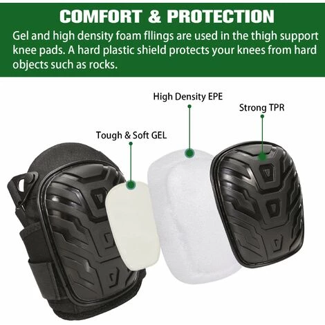 【Einfach einzustellen.】 Verstellbare elastische Doppelgurte und dreieckige Schnallen halten die Knieschützer fest an der anfälligsten Stelle Ihres Kniegelenks. Die einfach zu befestigenden Clips erleichtern das An- und Ausziehen der Knieschützer br>MEHRFUNKTION: Verwenden Sie dieses Paar Hochleistungsknieschützer für jede Art von Bodenbelag, um Ihren Komfort und Schutz bei Bauarbeiten, Bodenbelägen, Teppichinstallationen, Lagerarbeiten und vielem mehr zu erhöhen.