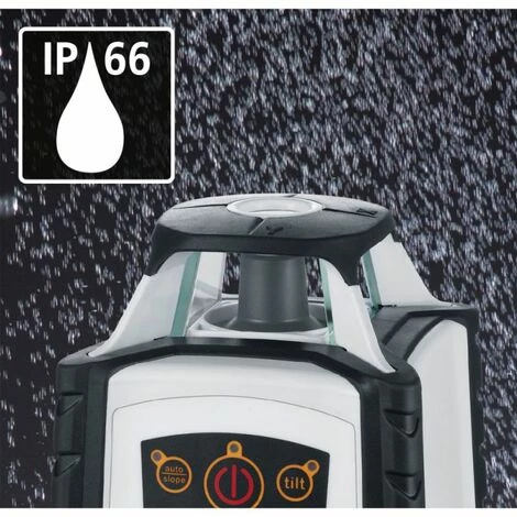 Der vollautomatische Rotationslaser mit großer Reichweite ist ideal für Aushub- und Ausschachtungsarbeiten. Das robuste Gerät ermöglicht ein genaues Nivellieren von Horizontalen und Vertikalen. Ein 90° Referenzstrahl dient dem Loten und Ausrichten von Trennwänden. Zu den verfügbaren Modi zählen der Punkt-, Scan-, Rotations- und Handempfängermodus. Neigungen lassen sich manuell anlegen. Die Kombination aus Leichtstativ, Laserempfänger und Messlatte ist optimal für das Festlegen und Arbeiten mit Referenzmaßen. Per Fernbedienung können alle Funktionen bis maximal 40 Metern komfortabel ferngesteuert werden. Bei einer Fremdeinwirkung erfolgt die automatische Abschaltung zur Verhinderung von Fehlmessungen. Durch paralleles Arbeiten und Laden des Akkus verliert der Anwender keine Zeit bei seiner Tätigkeit.