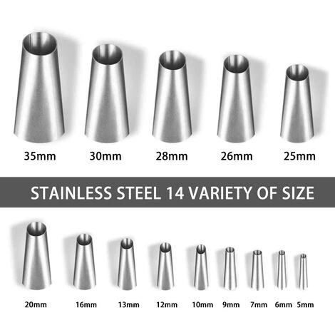 Abmessungen Edelstahl-Dichtdüsen: ca. 5 mm, 6 mm, 7 mm, 9 mm, 10 mm, 12 mm, 13 mm, 16 mm, 18 mm, 20 mm, 23 mm, 25 mm, 26 mm, 28 mm, 30 mm, 35 mm.