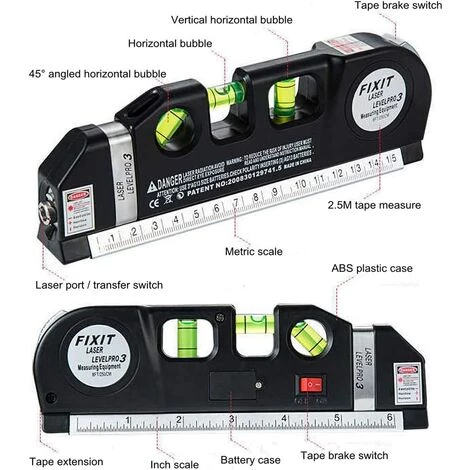 Es kombiniert ein Maßband, eine Nivellierlibelle mit drei Positionen und einen Lasernivelliergerät in einem Gerät.Entwickelt für alle Situationen, in denen eine gerade Linie oder präzise Messungen erforderlich sind t erforderlich.