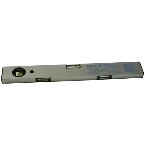 Gezogenes Leichtmetallprofil, silberfarbig eloxiert, tonnenförmige Horizontal- und Vertikallibelle aus unzerbrechlichem Acrylglas fest in den Wasserwaagenkörper eingeklebt. In die Auflagefläche sind je nach Länge der Wasserwaage eine unterschiedliche Anzahl der besonders stark haftenden Magneten eingebaut für guten Halt an allen magnetischen Flächen auch an lackierten und runden Gegenständen. Genauigkeit: mind. 0,5 mm/m = 0,029º.