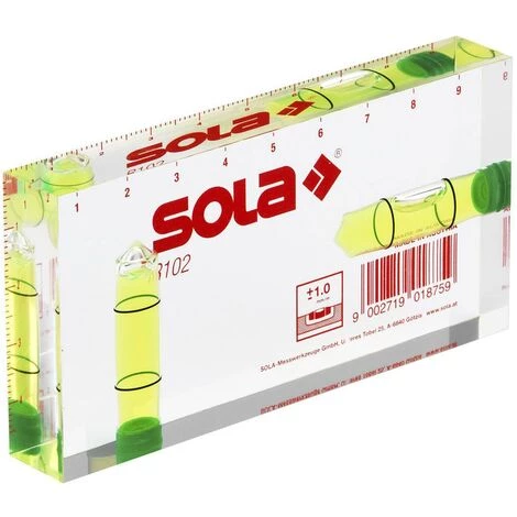 Die SOLA Wasserwaage R 102 grün transparenten Acrylglas. Sie ist kompakt, leicht, handlich und elektrich nicht leitend. Gegen Wärme, Waser und Költe ist die R 102 resistent.