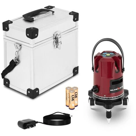 Der Kreuzlinienlaser verfügt über die Schutzklasse IP54 und ist somit vor Staub sowie gegen Spritzwasser geschützt. Des Weiteren besteht das Gehäuse aus Kunststoff, was zur Langlebigkeit beiträgt. Im Lieferumfang befindet sich ein Transportkoffer aus Aluminium, in dem das Messgerät und alle weiteren Zubehörteile sicher verstaut werden können.