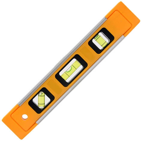 Qualitativ sehr gut verarbeitete Wasserwaage aus gelbem Speziealkunststoff mit einer Länge von 230 mm.