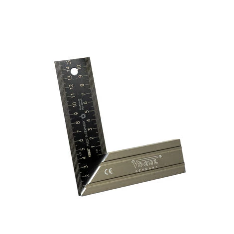 Die Schreinerwinkel von Vogel besitzen eine schwarz eloxierte und gehärtete (HRB 70) Aluminium Klinge und einen eloxierten Alugriff mit Profilnuten. Das Teilungsbild ist auf Vorder- und Rückseite eingelasert und Dank der schwarzen Beschichtung, blendfrei ablesbar.