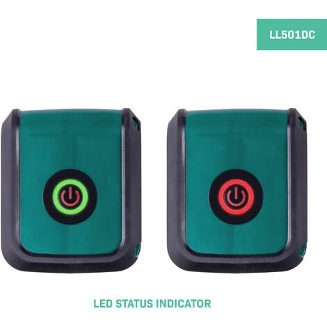 - LED-Statusanzeige: Wenn das Gerät nicht wasserwagengerecht genug ist (und daher außerhalb des Selbstnivellierungsbereichs liegt), leuchtet es rot und grün auf, sobald es wasserwagengerecht genug ist.