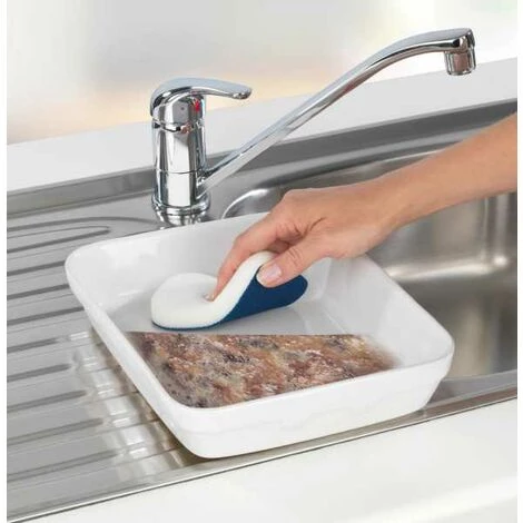 - 2-Phasen-Schwamm: Der Geschirrschwamm hat eine grobe Seite gegen extreme Verkrustungen und eine weiche Schwammseite zum Nachwischen. Die ergonomische Form sorgt beim Reinigen für einen perfekten Halt