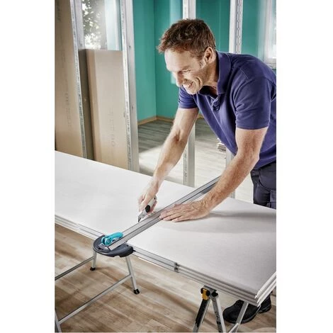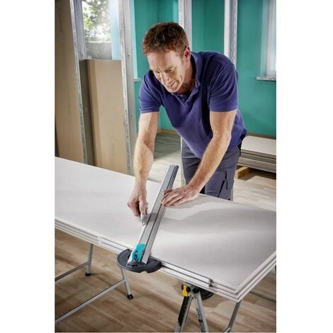 Mit der T-Schiene und dem Parallelschneider meistern Sie das Zuschneiden von Gipskartonplatten mit Leichtigkeit und Präzision. In nur 3 Arbeitsschritten erzielen Sie saubere Ergebnisse: geführtes Anritzen, Brechen, Durchtrennen der Kartonschicht – fertig. Dabei garantieren Ihnen die bewegliche T-Schiene mit Winkelfunktion und die leicht lesbare Skala eine präzise, winkelgenaue Führung ohne Gradabweichungen. So sind exakte Schnittkanten in Serie möglich, was Ihnen die anschließende Spachtel- und Schleifarbeit deutlich erleichtern wird. Der dazugehörige Parallel- und Streifenschneider ist mit einer leistungsstarken Trapezklinge ausgestattet. Er kann einfach auf dem Schneidschlitten verschoben und arretiert werden und sorgt für geführtes Schneiden in Serie: Klinge ausfahren, mithilfe der T-Schiene über die gesamte Platte führen, brechen, mit dem Cutter abtrennen und fertig.