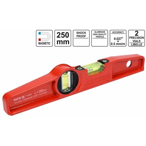 - Die 250 mm lange Wasserwaage ist aus Aluminium-Druckguss-Vollmaterial und beansprucht durch ihre schmale und abgeschrägte Form kaum Platz.